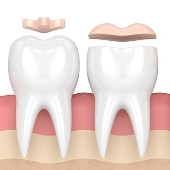 - Onlay – An onlay covers a larger area than an inlay. In addition to repairing the central chewing surface, it also restores one or more cusps of the tooth, providing extra strength and protection.